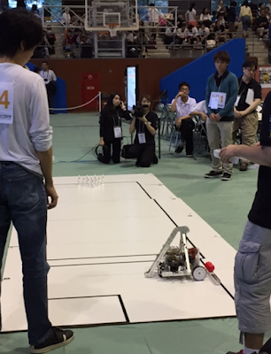 今年からはじまった、「ユニバーシティカテゴリー」のセミファイナルの様子です。ボーリングのルールと同じですが、ロボットは自分でボールを取りにいって、ピンに向かって投げなければならないのです。来年は、インテブロからも1チーム参加するかなー(๑•̀ㅂ•́)و✧