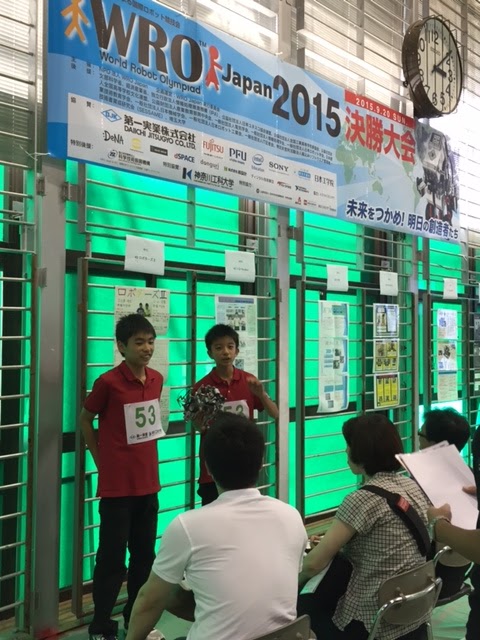 競技を終えたチームは、作ったロボットの設計やデザインについて、ポスターの前で発表しなければなりません。競技のポイントだけでなく、こうしたプレゼンの内容も採点されるのです。みんななかなかしっかりと発表していて頼もしいー。
