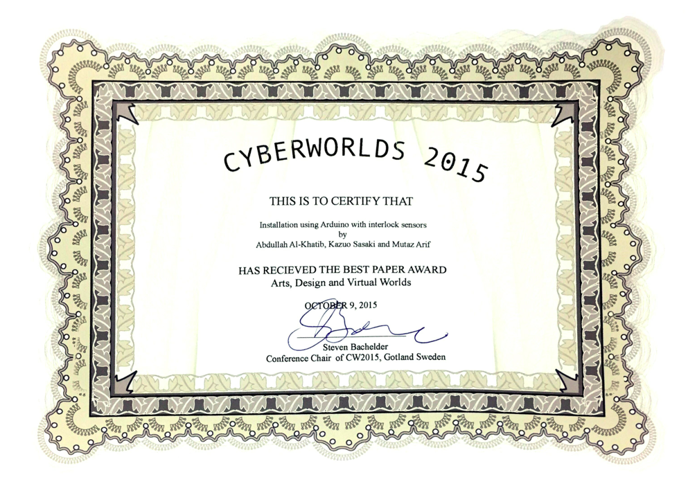 ミニコンピュータとセンサー技術を組み合わせた斬新なインスタレーション作品として、高く評価いただきました。今後は、そのインスタレーションを見てくださる観客とのインタラクションなども含めて、研究を発展できればと思います。座長である、ミラノ工科大学のムラ教授も、「来年のサイバーワールズ 2016 にも是非参加してください」と褒めてくださいました。