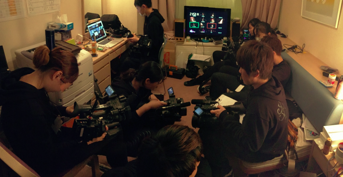 メディア学部では、このライブコンサートの模様を伝える「YMODE NET MAGAZINE in NAEBA 2016」という映像配信サイトのお手伝いをさせていただいております。昨晩は、特に最終日の「生配信」ということで、とりわけ力の入った撮影を担当させていただきました。下の写真は、撮影に向けて機材チェックをする学生スタッフです。撮影前夜には、松任谷正隆先生から激励のお言葉をいただき、テンションマックスで取り組んでいます!